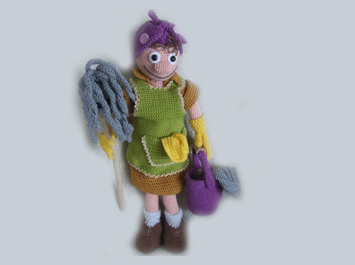 3 mm-crochet hook, Phildar Cotton :3 x Skincolor (=Phildar cotton poudre), 1 x green, 1 x purple, 1 x blue/white, 1 x gold, 1 x grey, 1 x brown, 1 x yellow, 1 x beige, little bit lilac, little bit black, little bit white