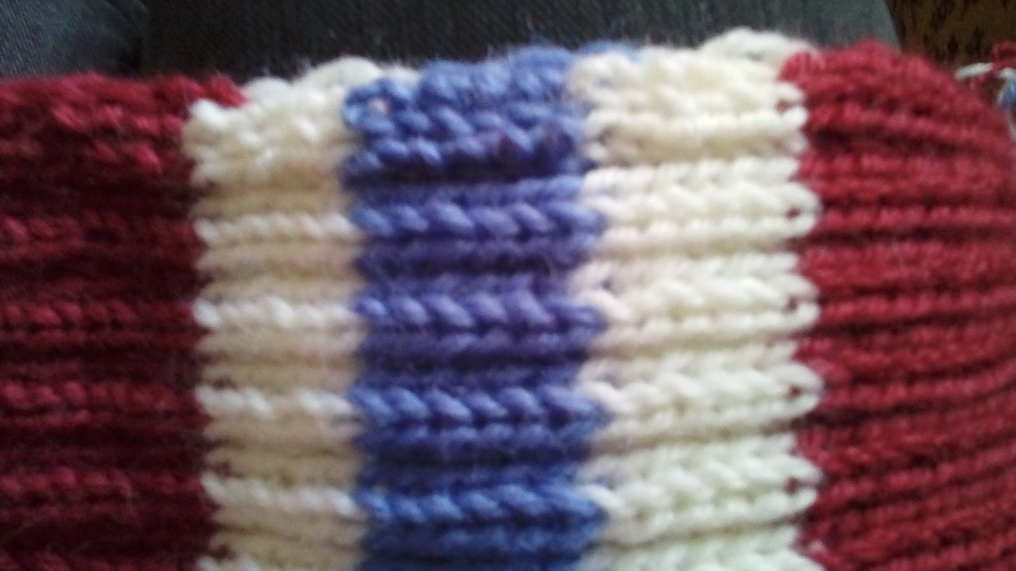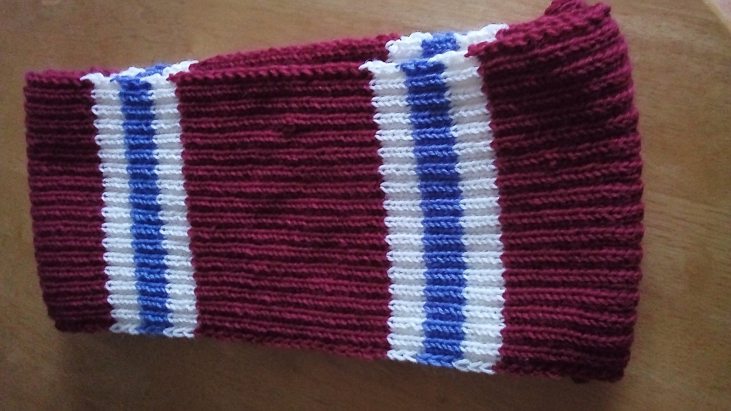 This scarf is the result of someone asking me to knit him a ‘Private Pike Scarf’. I have not yet seen the new Dad’s Army film, but for those of you who can remember the original (or have watched the re-runs), this is my attempt at duplicating the scarf. There is, of course, no reason why you cannot change the colours either to match your favourite football or any other team or club or just choose any three that appeal to you. This scarf can be knitted in any worsted weight yarn.