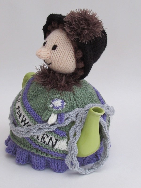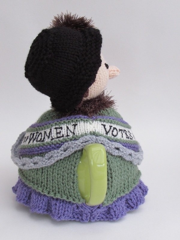 The suffragette tea cosy is a well dressed lady wearing a violet dress under a green coat with a fur collar. She has curls peeking from beneath a black hat with a fluffy detailing. As you would expect she has a Votes for Women sash on and is sporting a suffragette rosette.