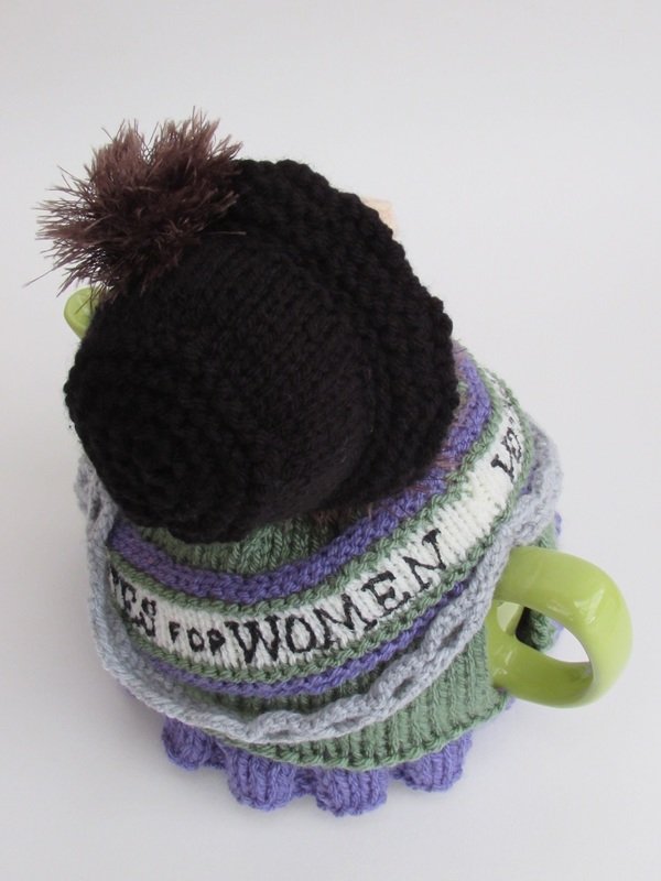 This votes for women tea cosy is currently on a protest and has chained herself to the teapot. There is a loop in the chain that loops over the spout of a teapot.