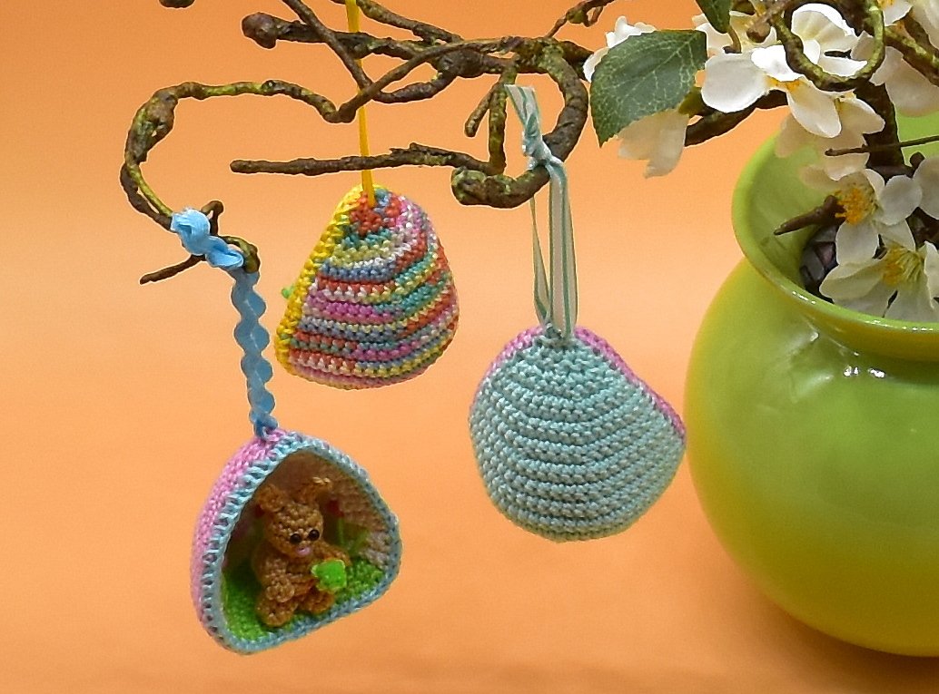 Alle Figuren und die Eier werden mit Baumwolle z.B. Schachenmayr Catania (50g/125m) und Nadelstärke 2 gehäkelt.