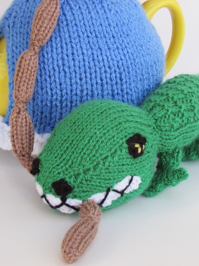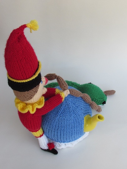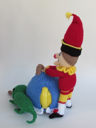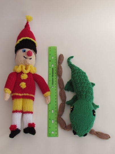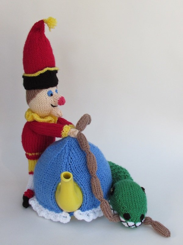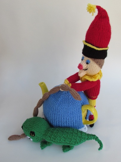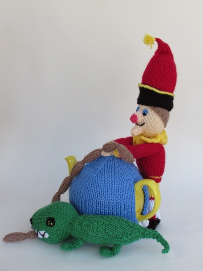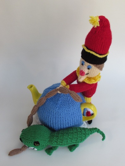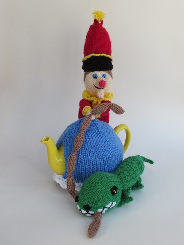 The Mr Punch and the crocodile can also be knitted up as toys. Mr Punch works out to be about 38cm tall, and about 8cm wide and the Crocodile stands 7cm heigh and is 29cm from nose to tail. When you buy the pattern to make the tea cosy, you will also be given the changes to make the dolls as separate items.
