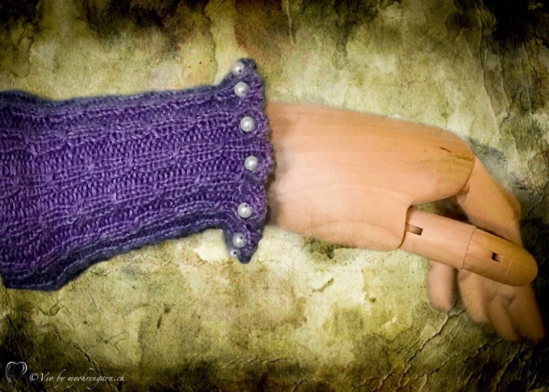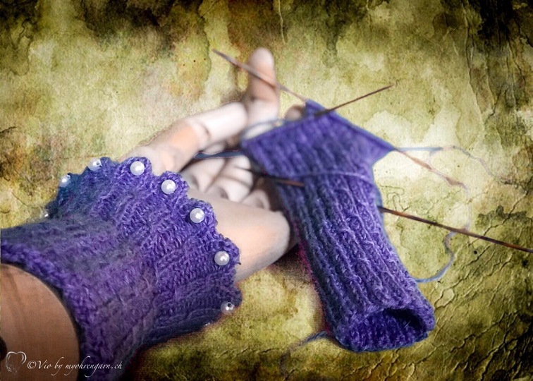 Die Armstulpen haben eine Länge von ca. 12.5 cm und sind für alle Grössen geeignet. Sie sind mit feinem Garn gestrickt und werden zur Hälfte nach innen umgestülpt. Sie wirken dadurch aussen sehr grazil und geben aber trotzdem doppelt warm. Die Wachsperlen werden von Hand aufgenäht, und verleihen den Armstulpen das notwendige Quäntchen Luxus. Ich habe hier weiche Sockenwolle aus dem Discounter gewählt. Denn nicht jeder hat viel Geld und möchte sich vielleicht trotzdem etwas Besonderes herstellen. Wer mehr Geld für ein teures Garn hat, kann aber jedes andere Garn mit einer Lauflänge von ca. 420m pro 100g verwenden, z. B. feines Merino- oder Cashmere-Garn.