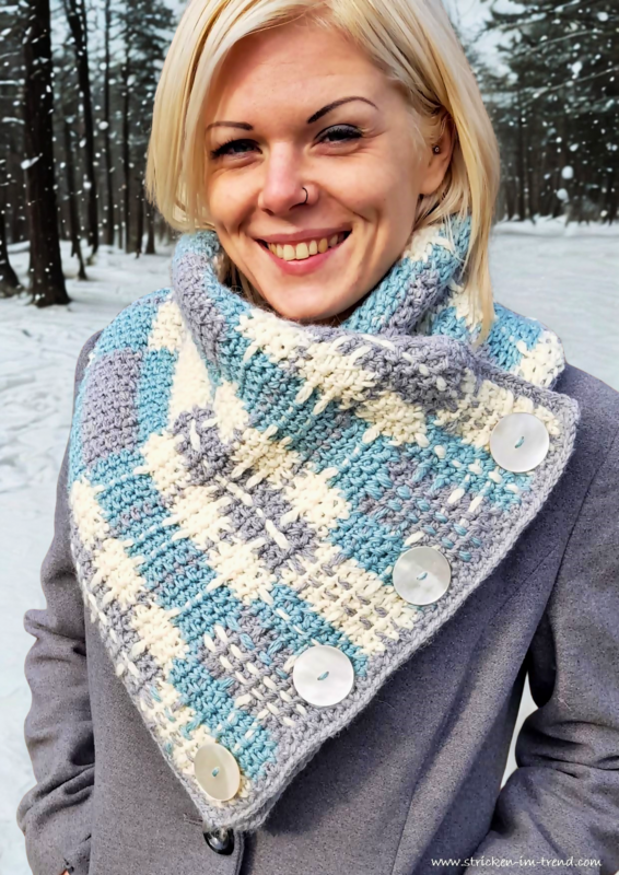 Neckwarmer #3 stands out with its striking tartan-inspired design, created using the Tapestry Crochet technique, which produces a beautiful woven texture.