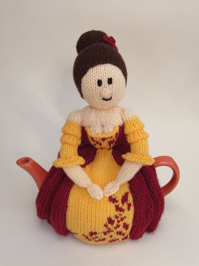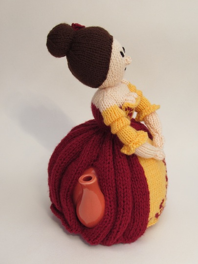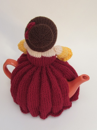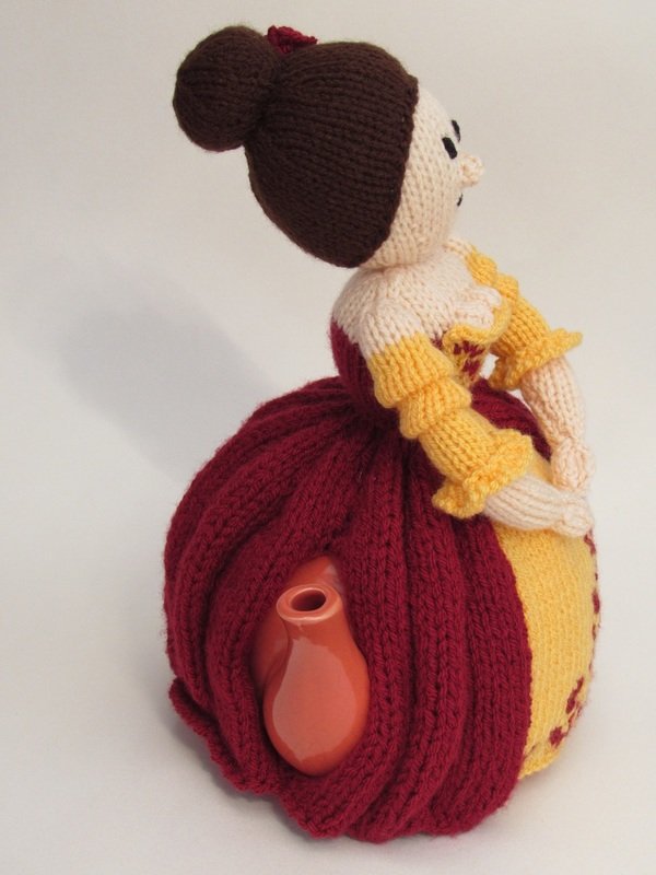 The crinoline lady tea cosy is an elegant tea cosy of a lady wearing a crinoline style dress. The skirt of her dress falls in pleats all around the back and sides. The front panel of the skirt and bodice is detailed with a leaf design which is knitted in. The dress is an off the shoulder style and she is wearing her hair up in a top knot which is decorated with roses.