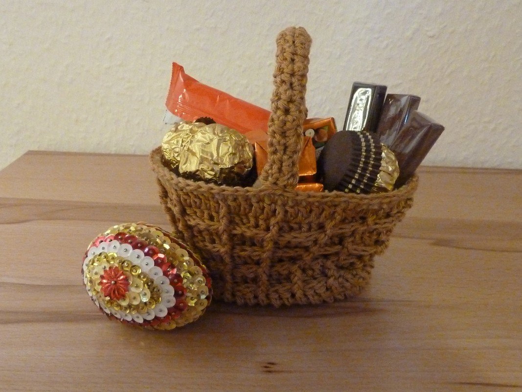 Gut gefüllt mit ein paar Süßigkeiten freut man sich über dieses Mitbringsel. Oder man stellt das Körbchen auf den Tisch zum Anbieten von Süßigkeiten.
