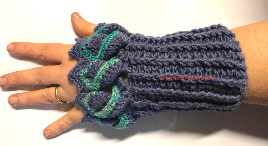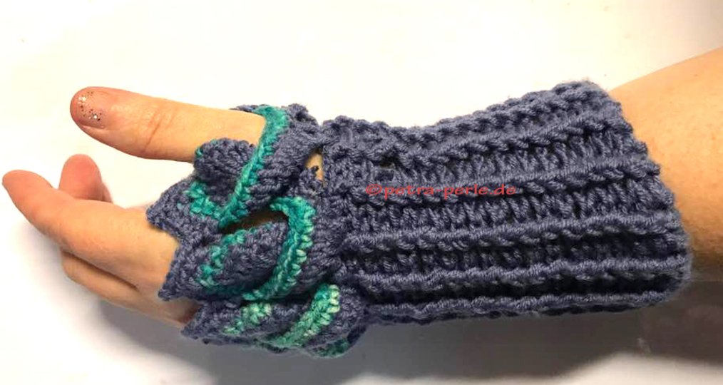 Die Stulpe Angelika ist flott gehäkelt. Da sie durch den Spitzenabschluss automatisch große Löcher hat, kann man überall den Daumen durchstecken und braucht keine extra Öffnung zu machen..!