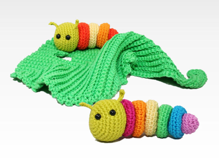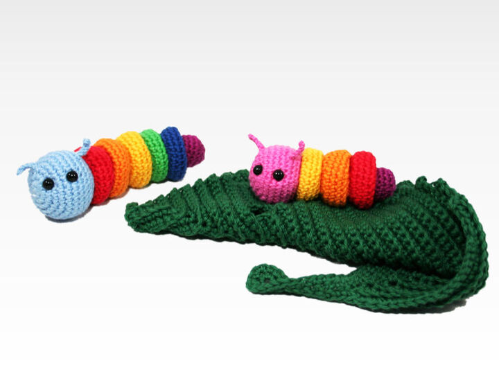 The items are crocheted in continuous rounds/spirals (caterpillar), as well as back and forth in rows (leaf).