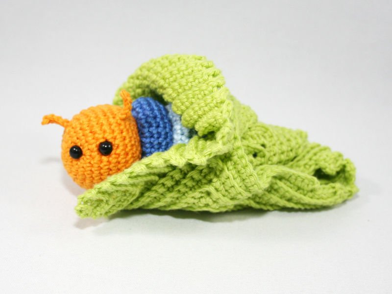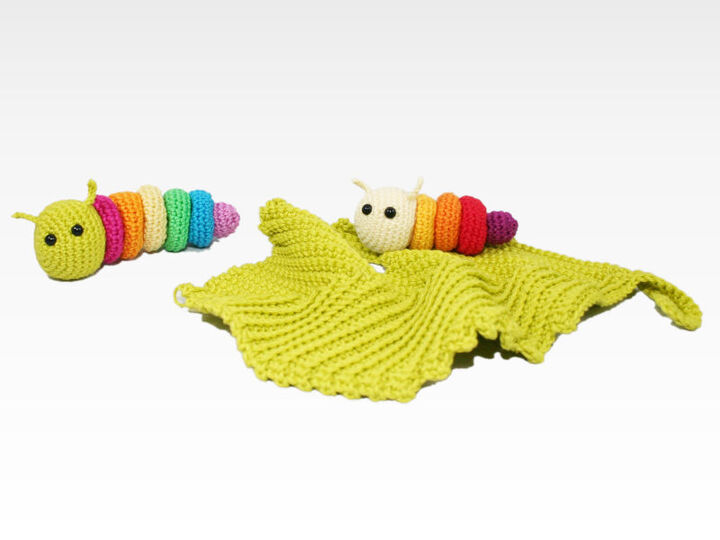 A cute lovey in shape of a little caterpillar on its leaf.