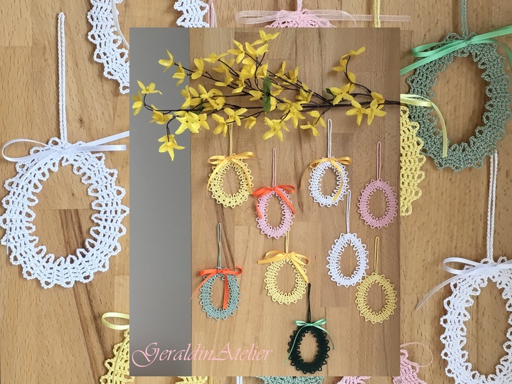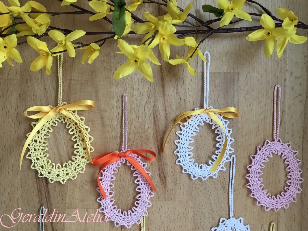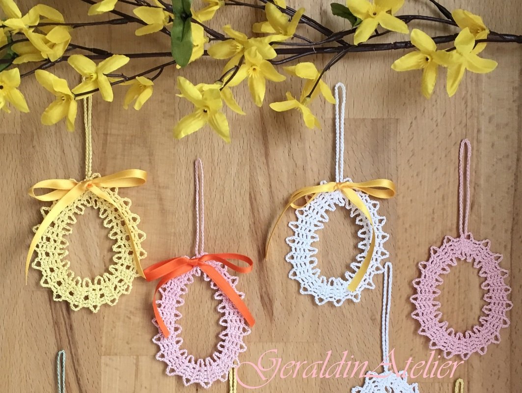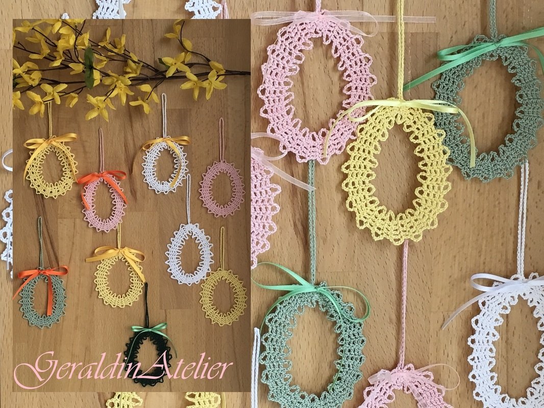 Die bunte Ostereier in Brügger-Spitzen Häkeltechnik bringen schöne Frühlingsfrische und sind eine gelungene Dekoration zu Ostern.