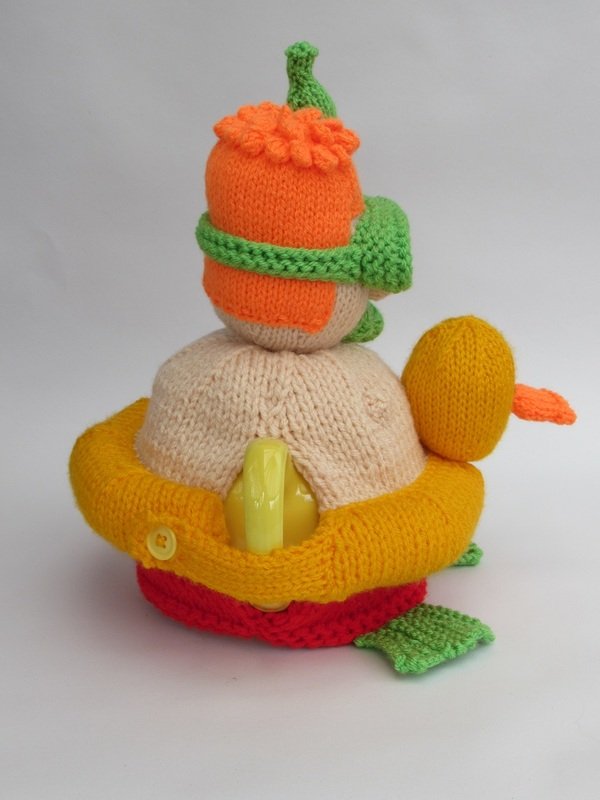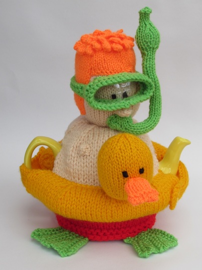 The snorkeler tea cosy depicts a scuba diver in snorkel mask. He has green flippers on his feet, red trunks and a yellow duck rubber ring. I wanted to create a comic diver, which is why I gave him the duck ring.