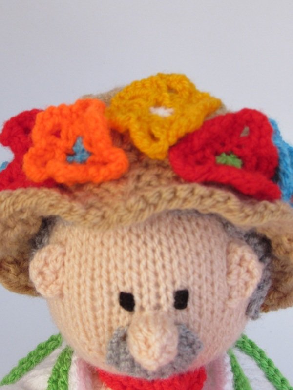 The Morris dancer tea cosy has all the bells and ribbons. He's sporting a green baldric as he dances with his stick and hankie. His hat is removable revealing the Morris mans head and hair. I designed the Morris dancer tea cosy to be an older gentleman with grey hair and a moustache.