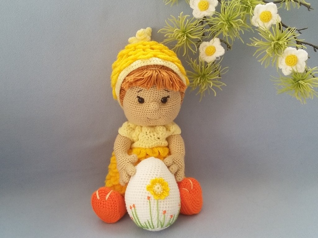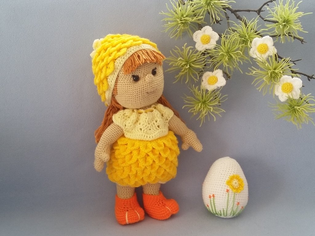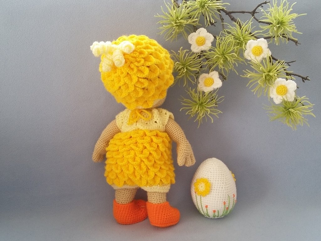 Ihr erhaltet eine ausführliche 39- seitige Anleitung mit vielen Fotos zum Nacharbeiten. Die Größe der Puppe liegt ca. bei 36 cm. Die PDF beinhaltet die Anleitung für die Puppe, den Overall, die Küken-Schuhe, die Mütze, sowie für die Blümchen und das große Osterei.