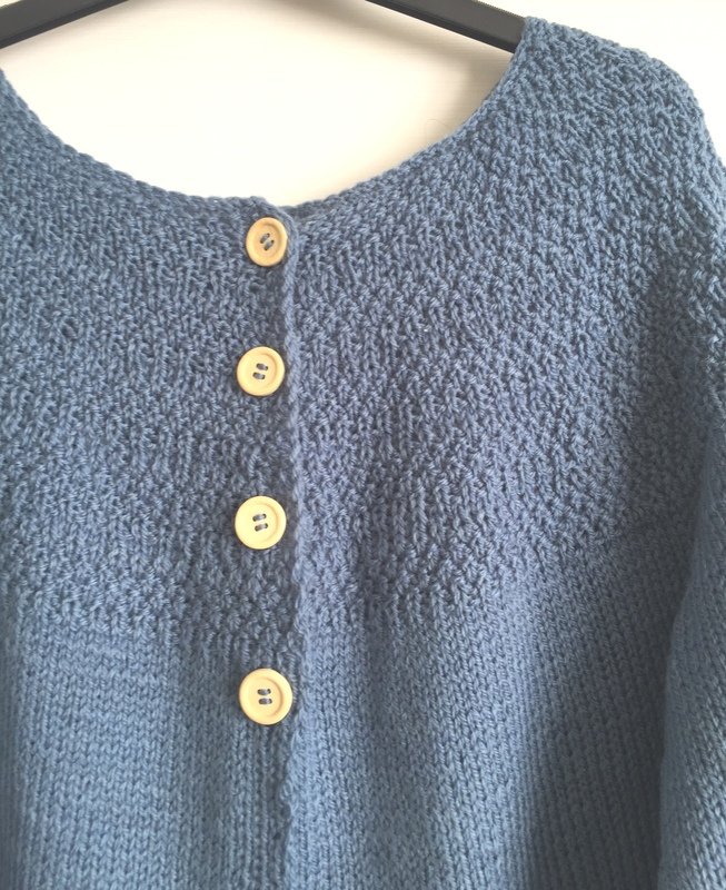 This pretty cardigan has a circular / round yoke consisting of segments with pattern and Raglan increases. The cardigan is worked from the top down, knitted flat and in the round.
