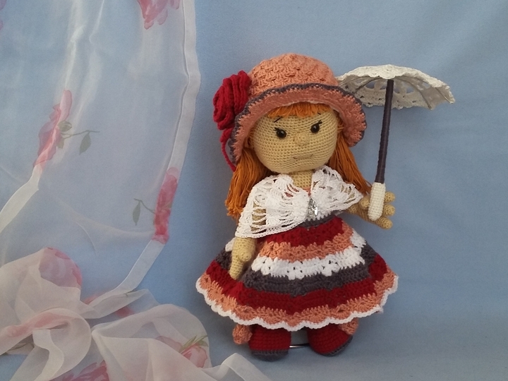 Die Größe der Puppe liegt ca. bei 36 cm. Die PDF beinhaltet die Anleitung für die Puppe, das Kleid, die Schuhe, den Hut mit Rosenblüte, sowie für die Stola und den Sonnenschirm.