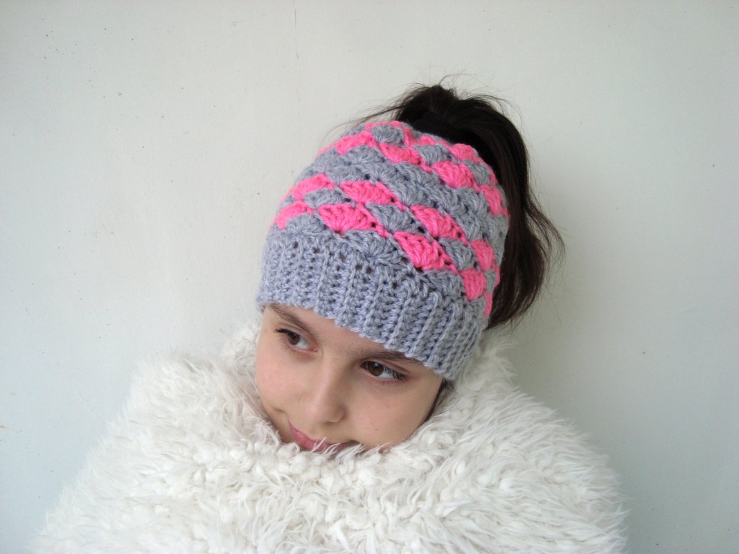 Crochet Messy bun hat pattern Winter beanie with hole for hair Women's hat with pattern Slouchy girl's hat tutorial Easy seashell hat.