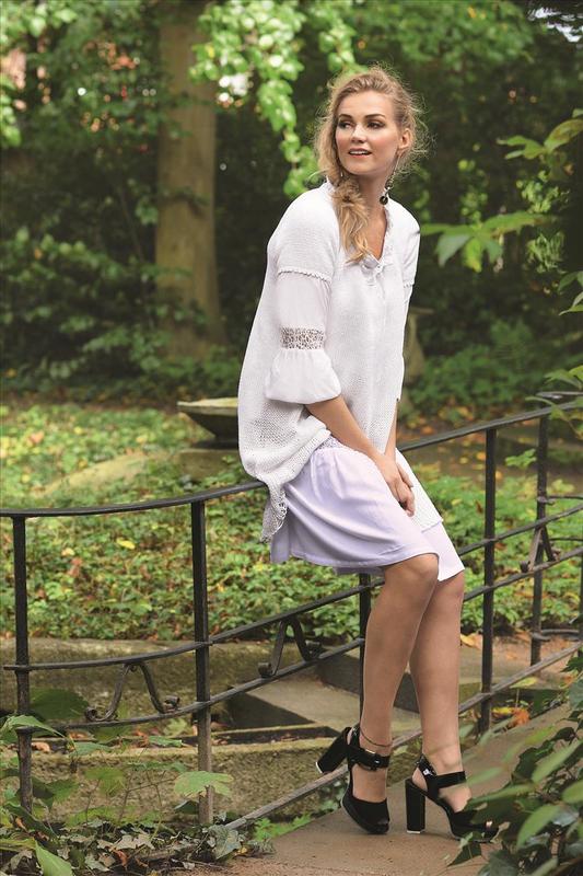 Zeit die Stricknadeln aufzuräumen: Bei diesem Modell fangen Sie mit Nadel 10 an, und verkleinern alle 10 cm die Nadel um eine Nummer bei gleich bleibender Maschenzahl. Das Ergebniss ist eine schmeichelnde A-Form, die als Kleid oder Tunika getragen werden kann.