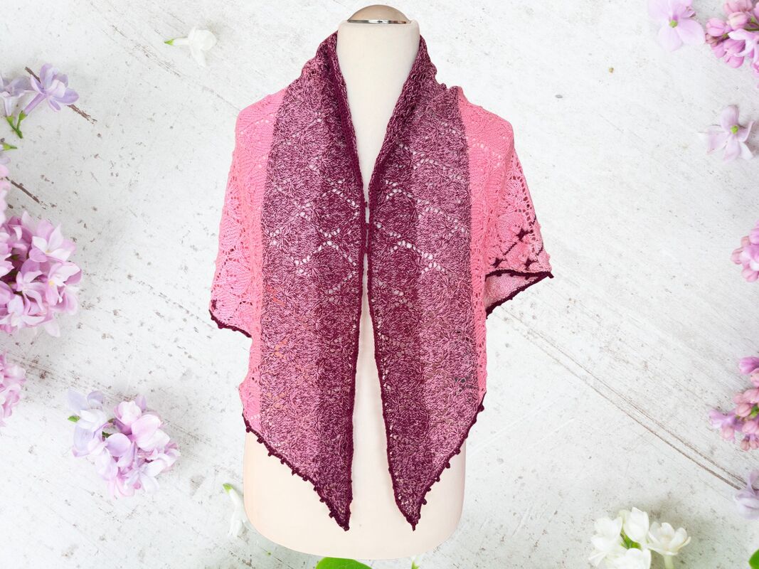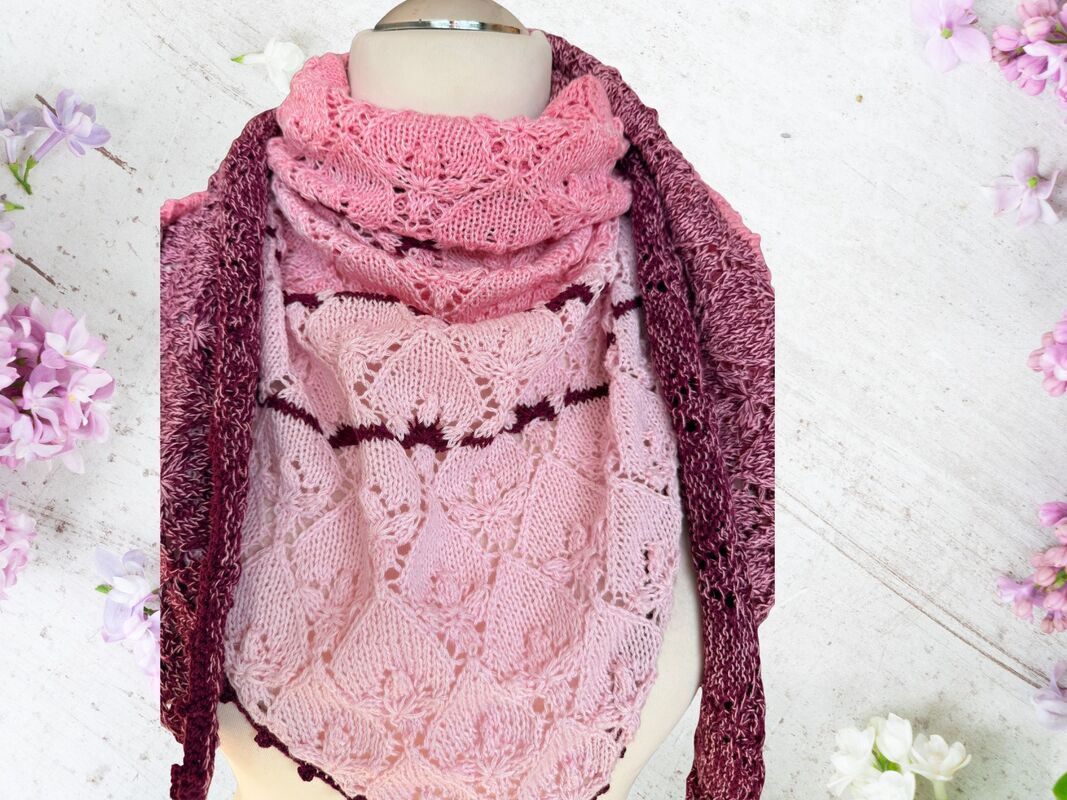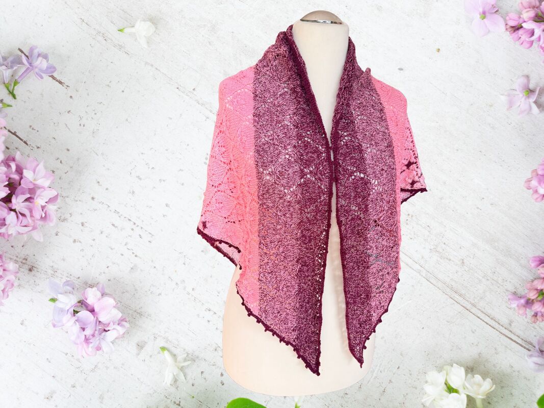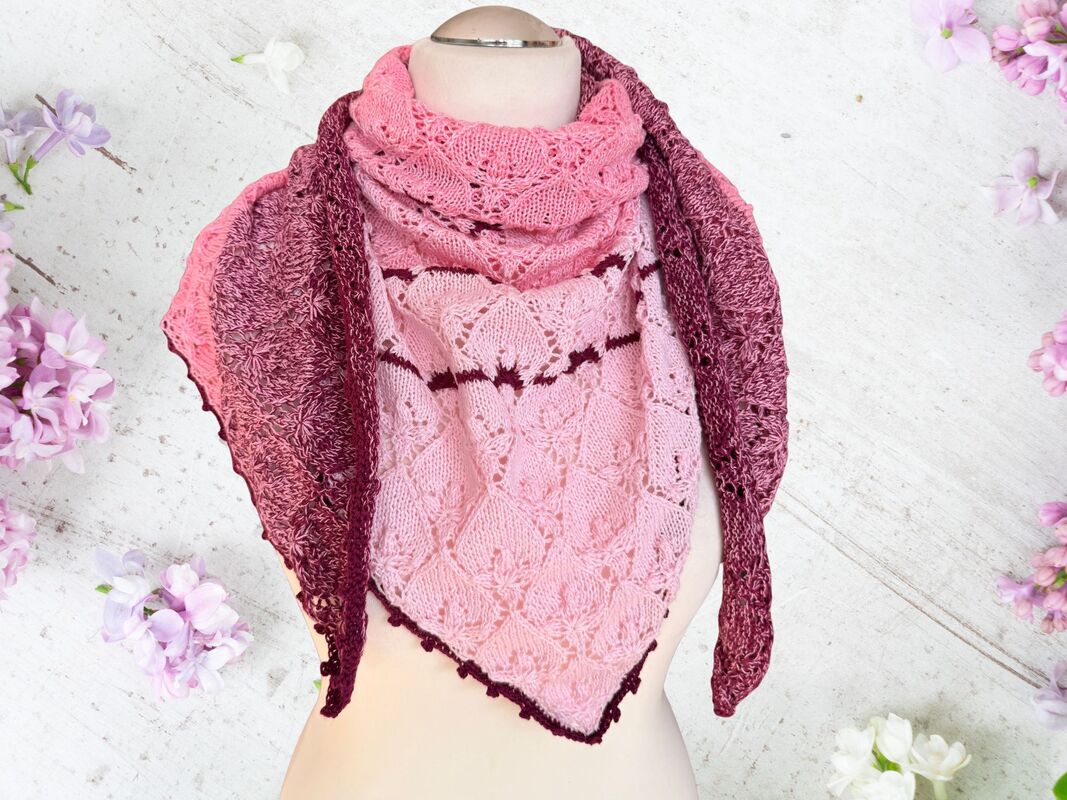 Das Dreieckstuch Fliederknospen wird von der unteren Spitze nach oben gestrickt. Ein feines Lochmuster bildet kleine stilisierte Fliederknospen, die sich regelmäßig über das gesamte Tuch verteilen und dem Tuch eine elegante und ruhige Struktur verleihen.