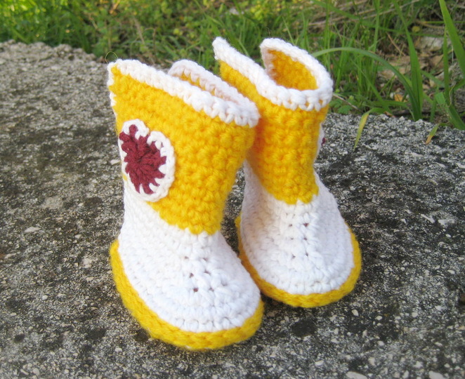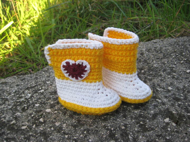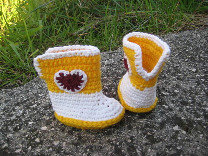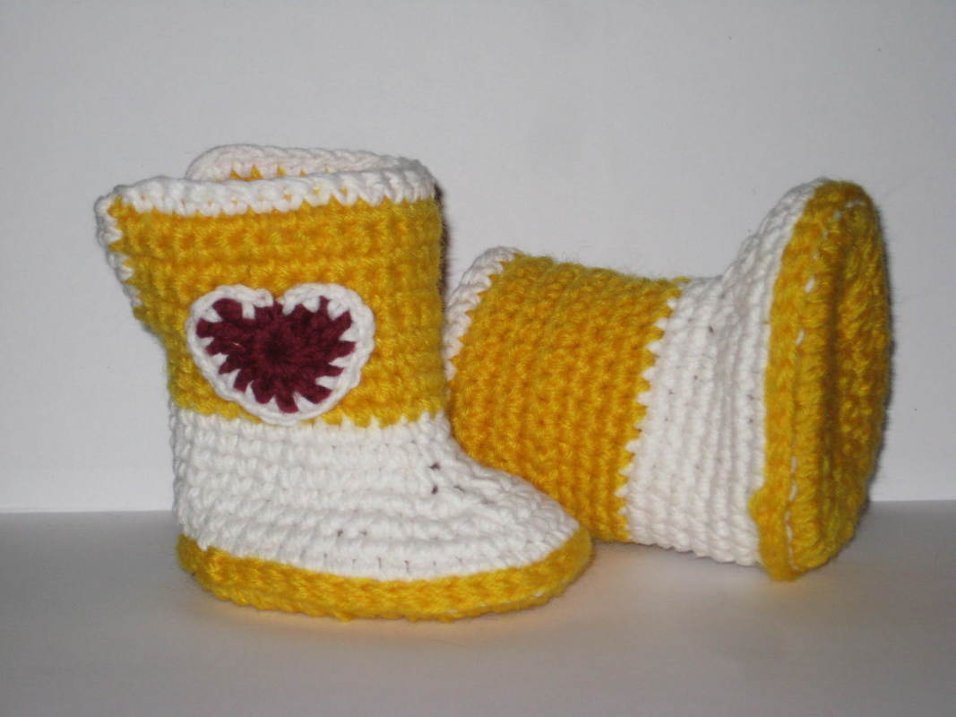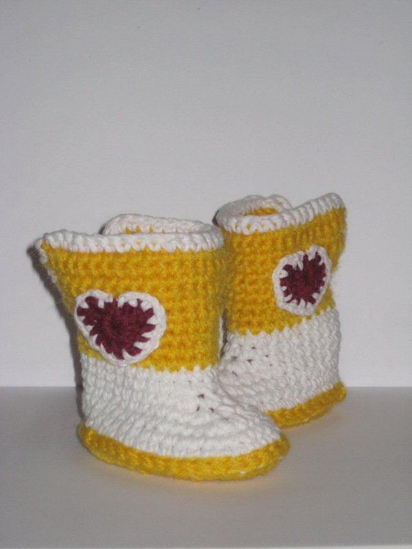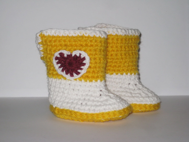 Crocheted white and yellow baby booties with dark red and white heart is a perfect gift for your little baby boys and girls. You can make it from cotton, acrylic yarn or wool. Pattern is written in English, U.S. terminology.