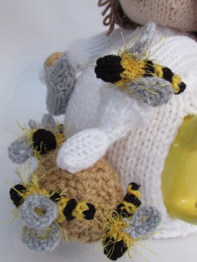 The beekeeper tea cosy looks a bit like a bygone age. She has her smoker, with smoke coming out of the nozzle, and a skep to catch a new swarm of bees. There are eight honeybees buzzing about her. And each bee has a slight fluffiness to it's abdomen.