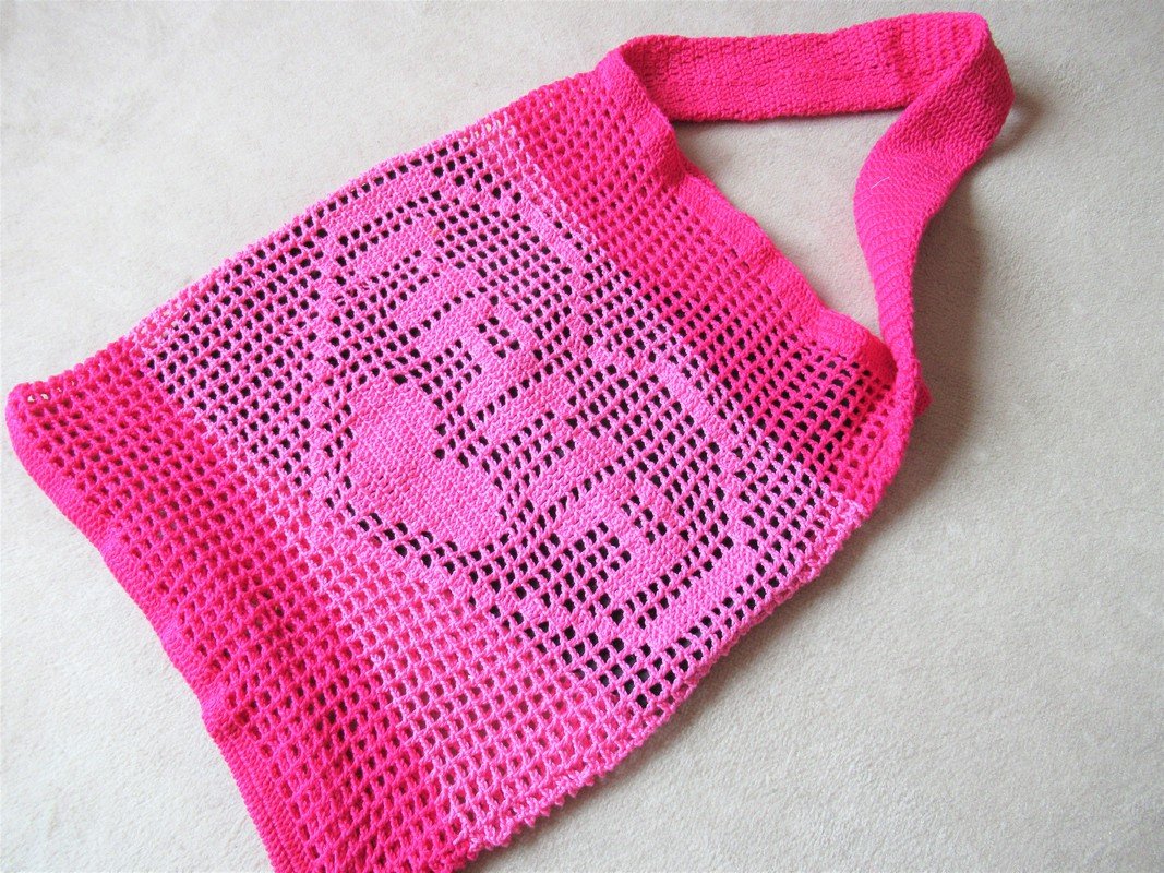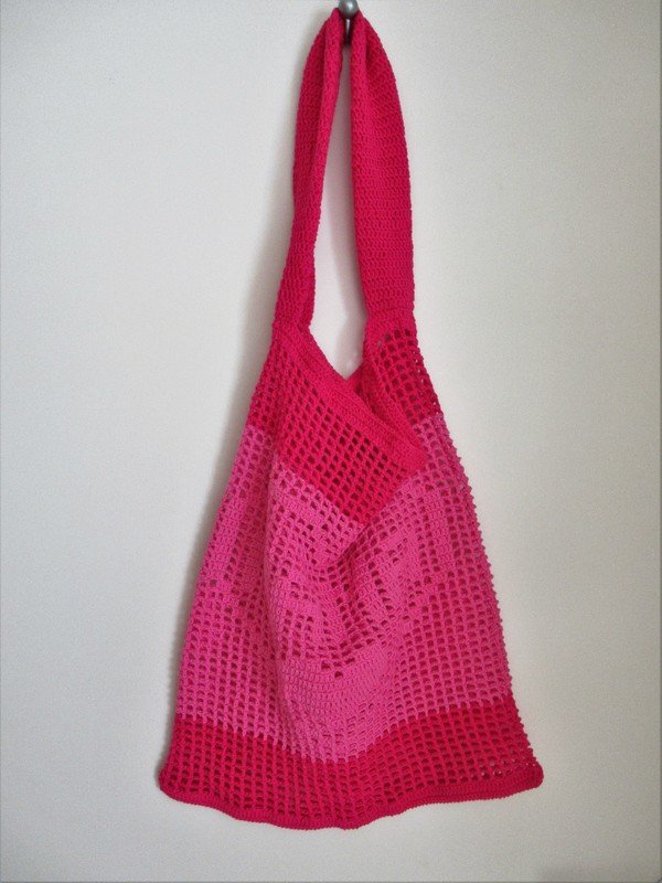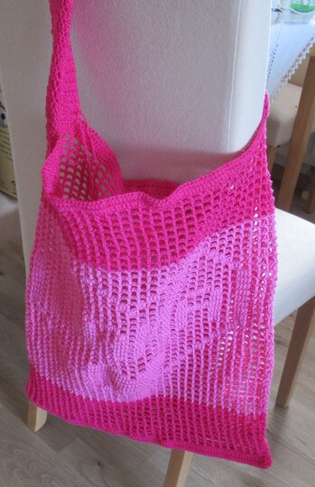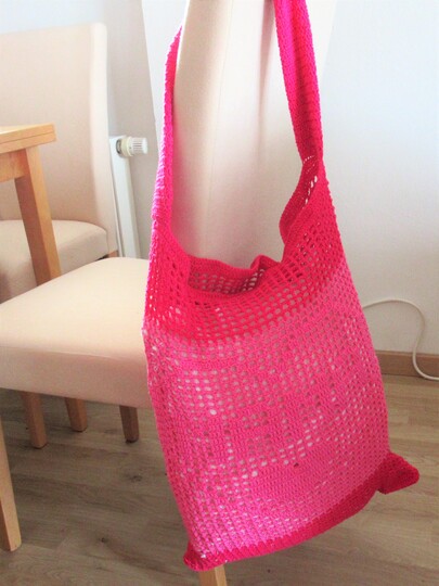 Die Tasche wird mit dem vorgeschlagenen Garn etwa 40 cm x 50 cm groß. Durch das Filetmuster, das in der Anleitung ausführlich erklärt wird, ist sie schnell und einfach zu häkeln.