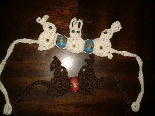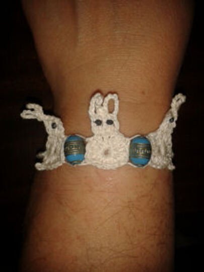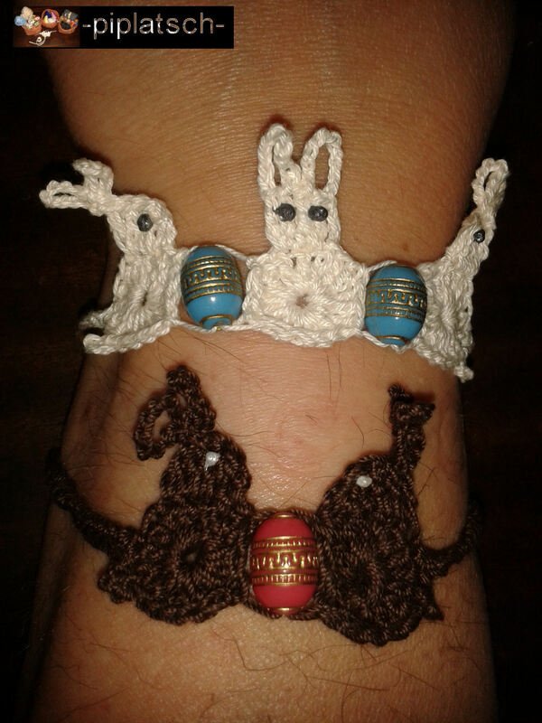 2 und 3 niedliche kleine Hasen als Armband, die ihre bemalten Eierchen festhalten.