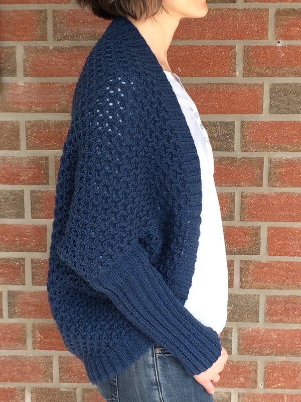 Der Ärmelschal entsteht ganz easy aus einem Rechteck, mit auffallendem Lochmuster, an das die Ärmel angestrickt werden.