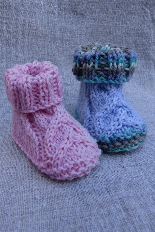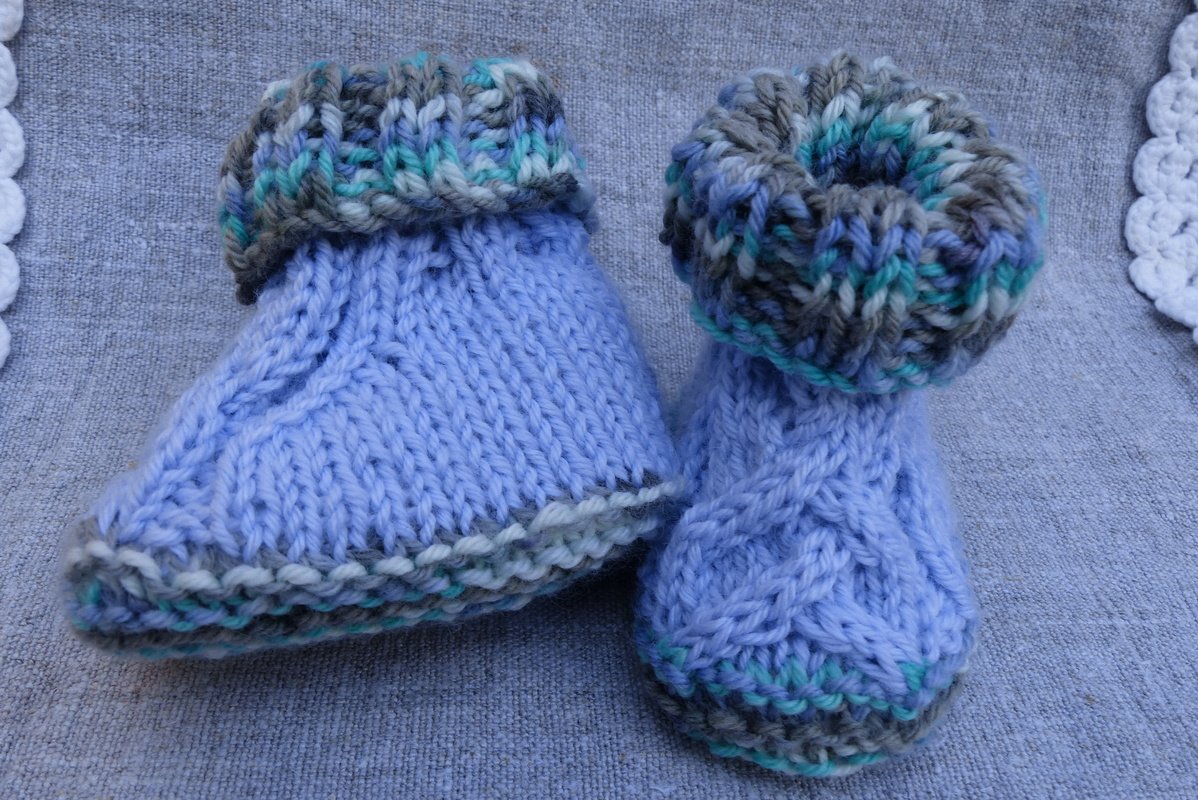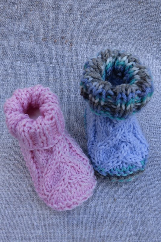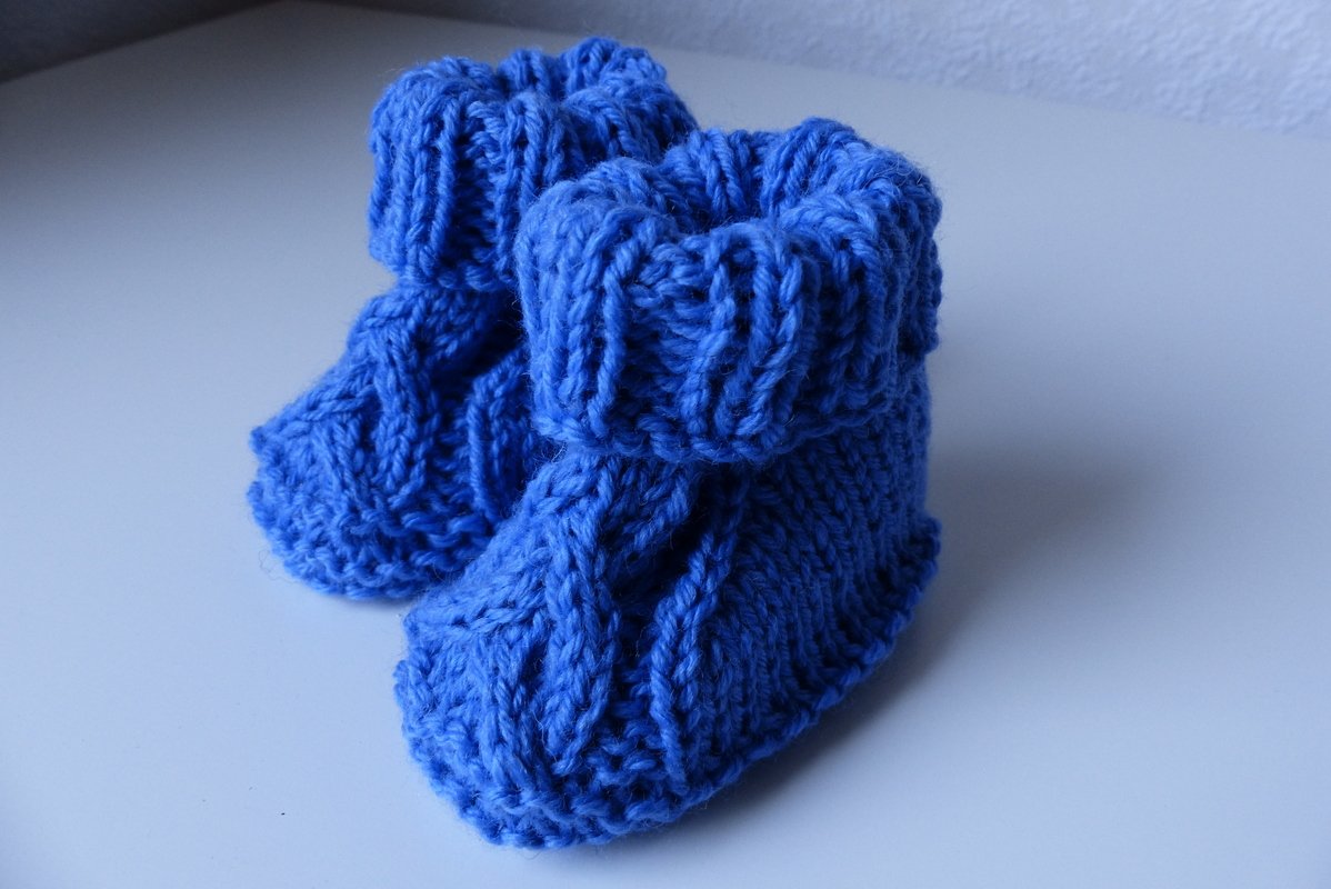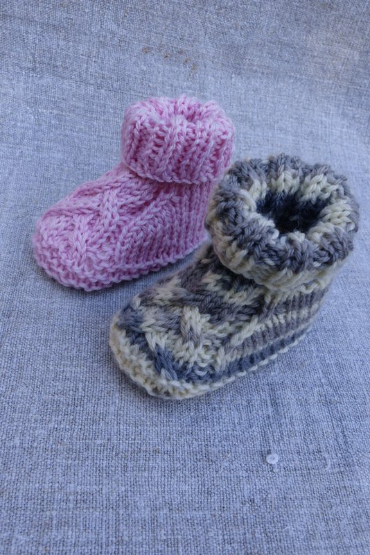 Je nach Lauflänge der Wolle und Nadelstärke wird der Schuh zwischen 9 cm und 11,5 cm groß.