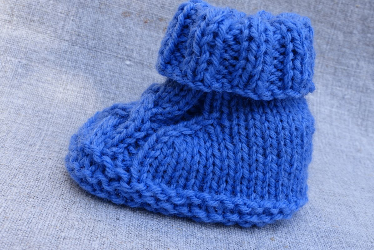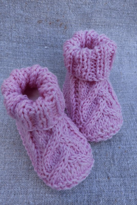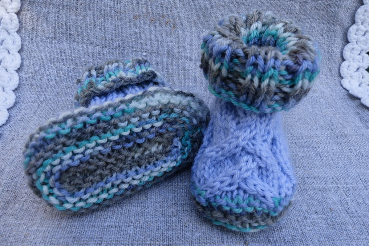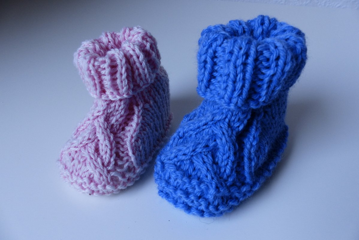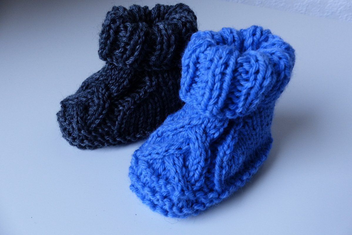 Die Schuhe werden an der Sohle mit 2 Nadeln aus dem Maschenspiel begonnen und später wird weiter im Kreis gestrickt.