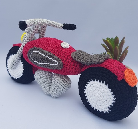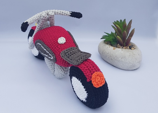 With the mentioned yarn your motor bike will be approx. 11 cm (4 inch) height and 23 cm (10 inch) long
