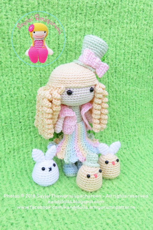 Crochet pattern to create a lovely girl doll with skirt, jacket and hat. The patterns for the little chick and bunny are included.