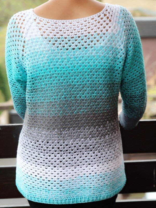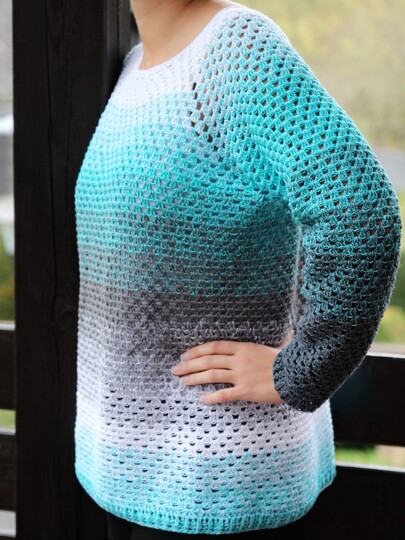This sweater is easy to crochet, the pattern is easy to remember and the result speaks for itself: a wonderful sweater that can be worn all year round! You can easily adjust it to other sizes than described in the instructions.