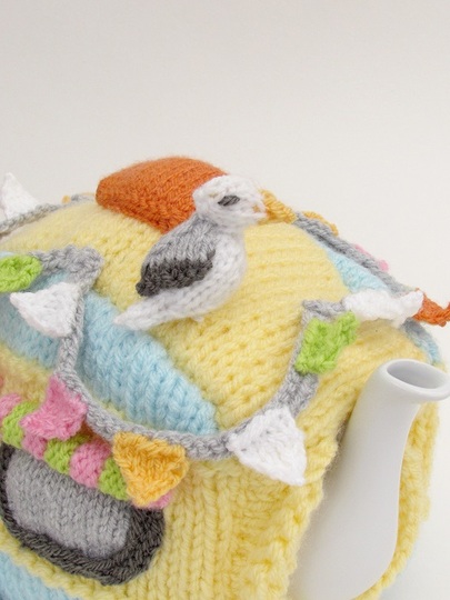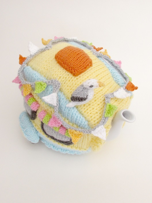 The caravan tea cosy has three windows with striped pelmets, a door, chunky wheels, a orange skylight and is adorned with bunting. On the top of the caravan a cheeky seagull has perched on the roof.