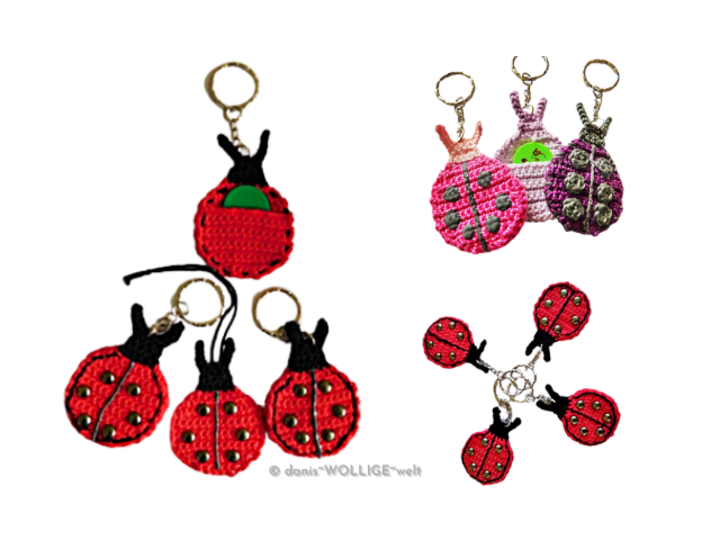 Verwendet werden kann das Käferchen als Chiptasche am Schlüsselbund, Applikation auf Taschen/Hosen, Geschenkeanhänger, Blumenstecker usw. Oder Du häkelst den Körper 2x und dekorierst ihn von beiden Seiten, wenn er nicht als Chiptasche dienen soll.