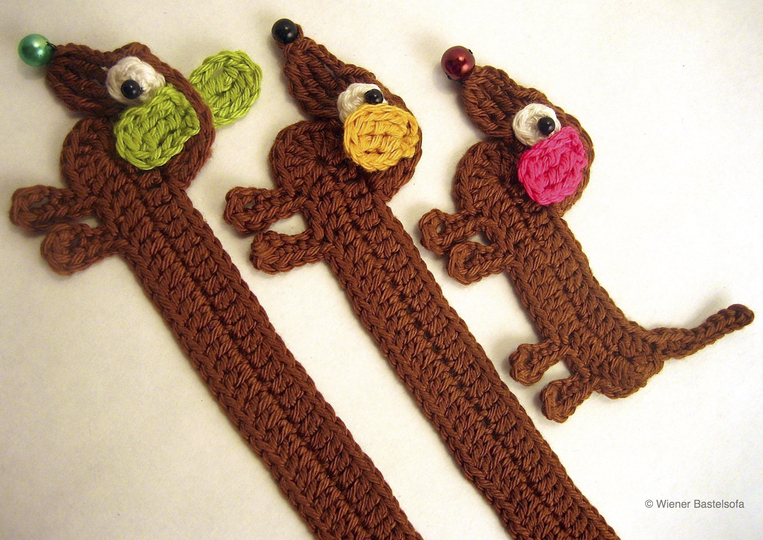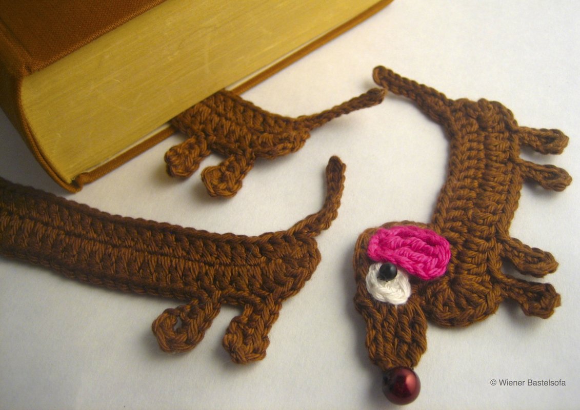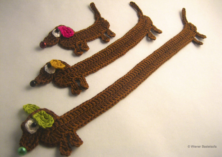 Die lustigen Dackel sind sehr schnell gehäkelt und eignen sich auch wunderbar zum Verwerten von Resten. Die Angaben in der Anleitung sind für 2 Dackel-Applikationen mit 9 und 19 cm Länge und ein Dackel-Lesezeichen mit 29 cm Länge gemacht. Diese Längen kannst du natürlich auch ganz einfach verändern.