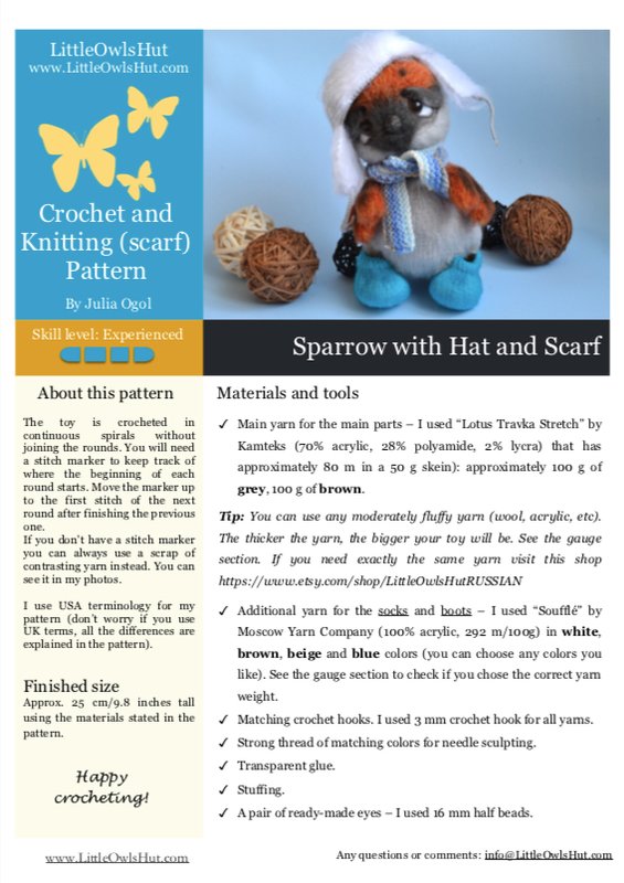 ✓ Additional yarn for the socks and boots – I used “Soufflé” by Moscow Yarn Company (100% acrylic, 292 m/100g) in white, brown, beige and blue colors (you can choose any colors you like). See the gauge section to check if you chose the correct yarn weight.