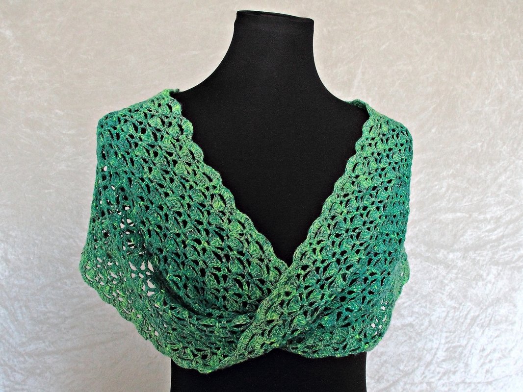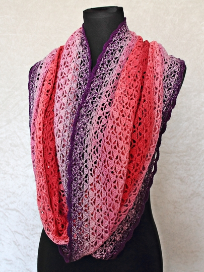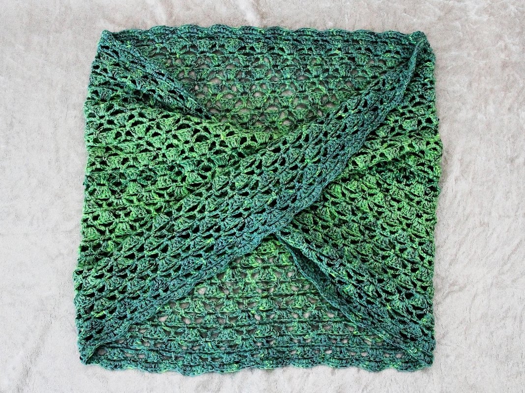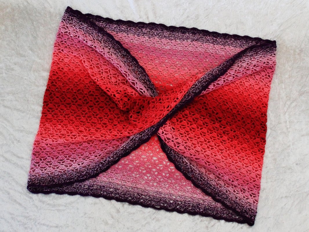 The cowl can be worked in your desired length and width. The pattern is of 2 repeating rounds plus a little finishing border.