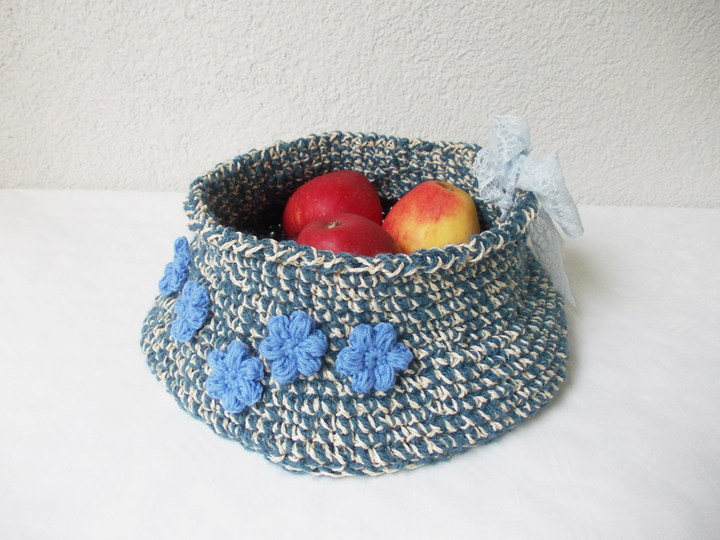 For the blue basket I used two different materials, one polyacrylic wool, suitable for crochet hooks No. 3 - 4 and the other binding yarn, 80 meters, diameter 1 mm. The twine makes the basket pretty stable. Diameter 25 cm andthe height is 10 cm.