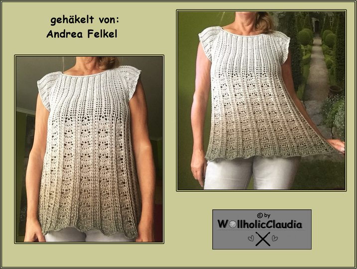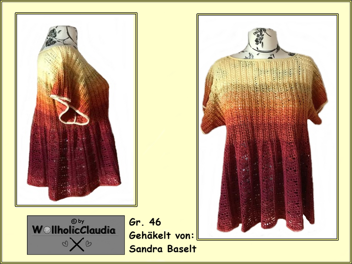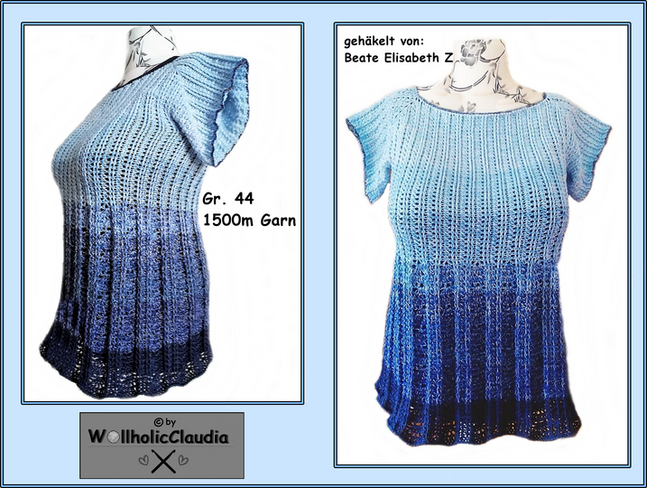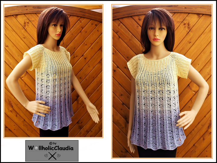 Sie wird in Runden von oben nach unten gehäkelt ( Rvo = Raglan ) und ist ideal für alle Farbverlaufsgarne.