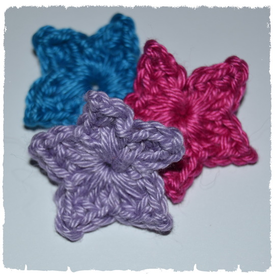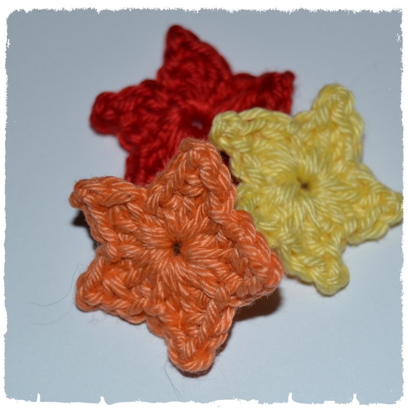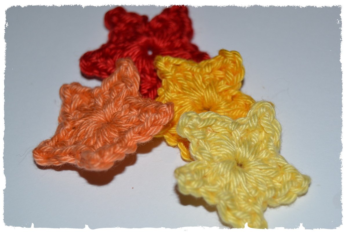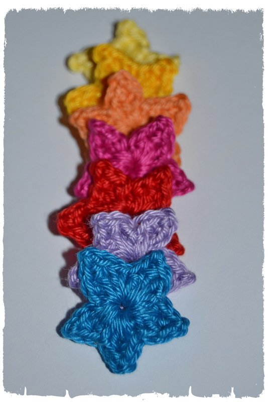 Diese kleinen süßen Sternchen sind ganz schnell gehäkelt. Sie können Geschenke, den Weihnachtstisch, Mützen oder Schals verschönern und sogar als Weihnachtsbaumschmuck verwendet werden. Ich habe sie hier aus Baumwollgarn in verschieden bunten Farben gehäkelt, du kannst sie aber auch uni oder aus Lurexgarn fertigen.
