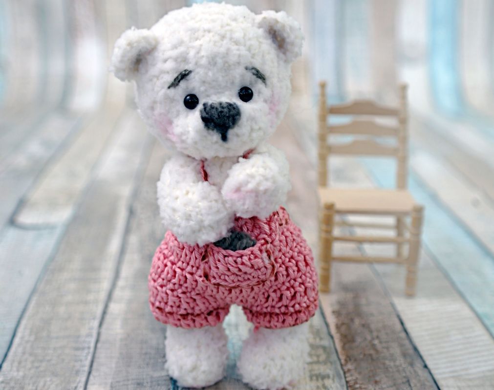 Material: Häkelnadel Nr. 2 Bär: Baby Soft Wolle von Lana Grossa in Weiß ca. 30 gr. Latzhose: Baumwolle 50g/140m – 15 gr. Nähnadel Tieraugen