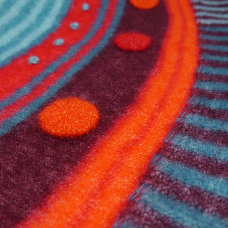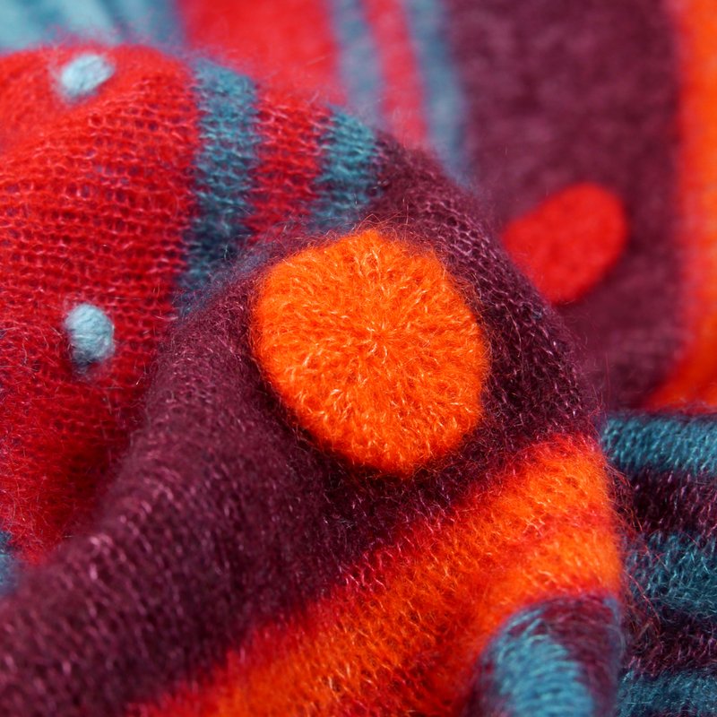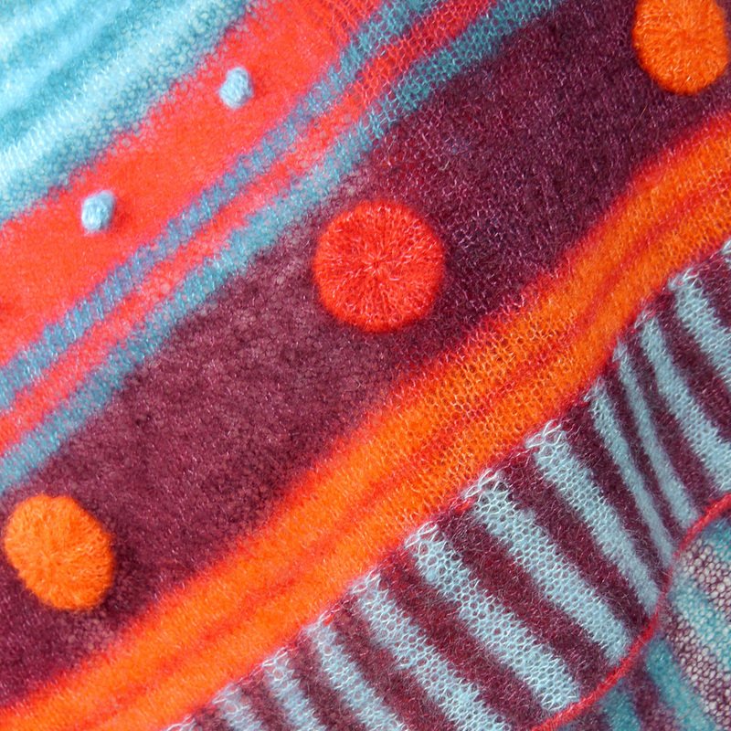 Treat yourself to a luxury crescent shaped shawl in precious mohair and silk that stands out with a dramatic color combination and unusual details. It reminds me of the necklaces of the ancient Egyptians and I believe Hatschepsut, the legendary Lady Pharaoh of old, would have loved it in chilly winter nights. This statement piece will accompany your casual and festive garments. You would prefer other colors? Please have a look at the pictures – there are other color combinations!