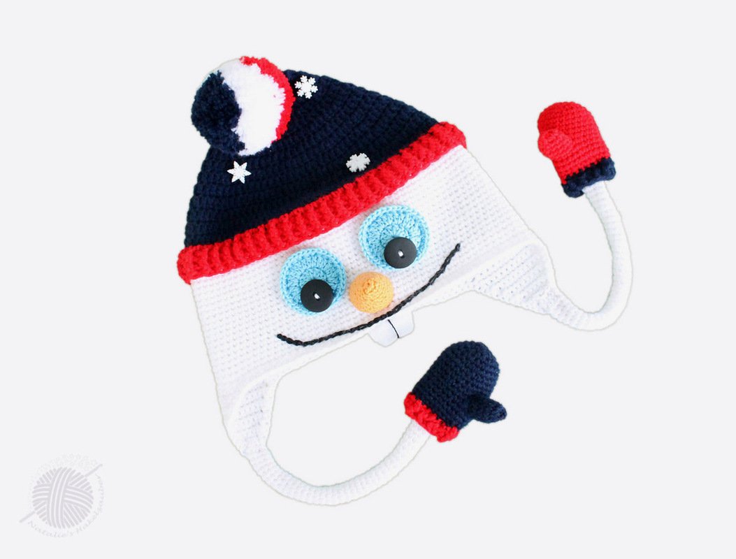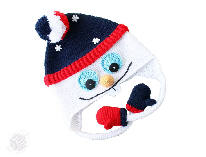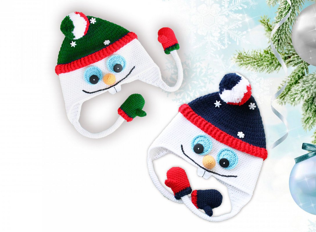 This PDF crochet pattern consists of illustrated tutorial for crocheting a hat in the shape of a snowman with mittens. The hat can be crocheted for both children and adults. The size is adjusted while crocheting the base of the hat (explained in the pattern).