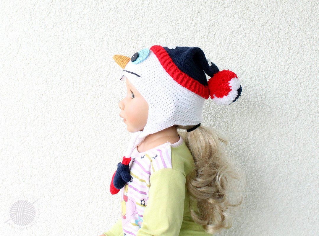 It explains: material, size chart hat, snowman (nose, eyes, mouth), ear flaps, cords with the gloves, over 20 photos, 12 pages.