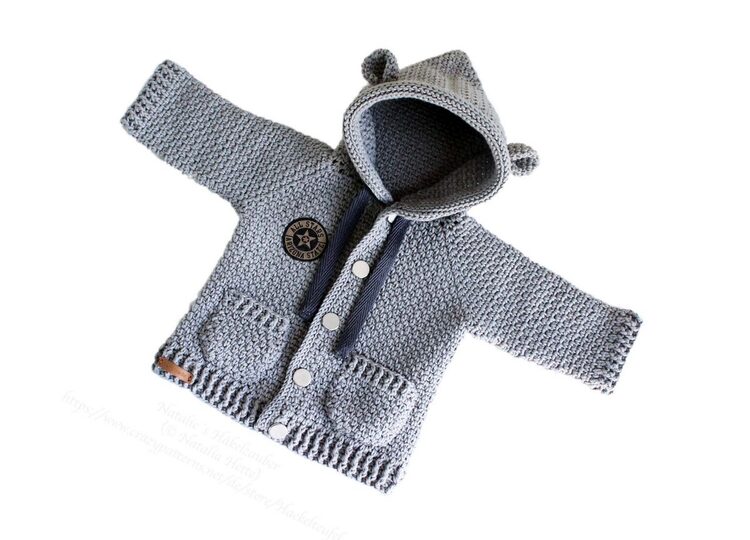 It is explained: material, calculation for size 0 m. to 6 y., back, front parts, sleeves, hood, ears, pockets, drawing, crochet diagrams, over 50 photos of steps, 24 pages, link to the video with crochet shoulder yoke (with the subtitles) and with crochet sl st.