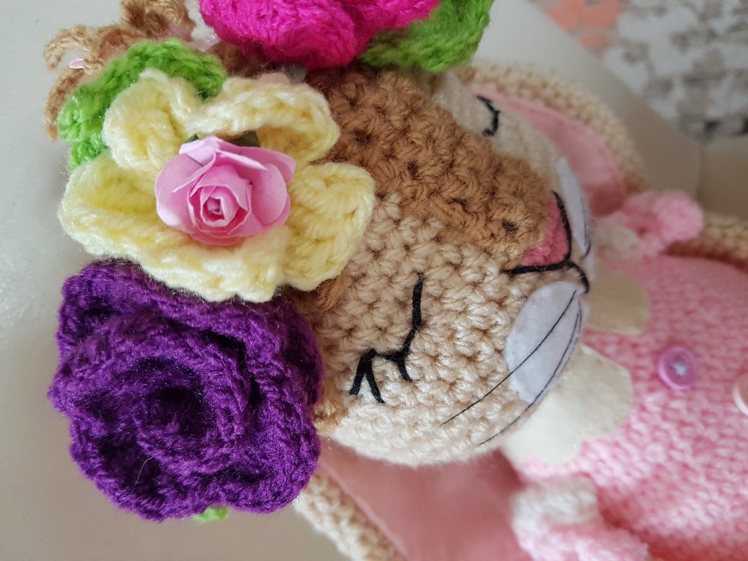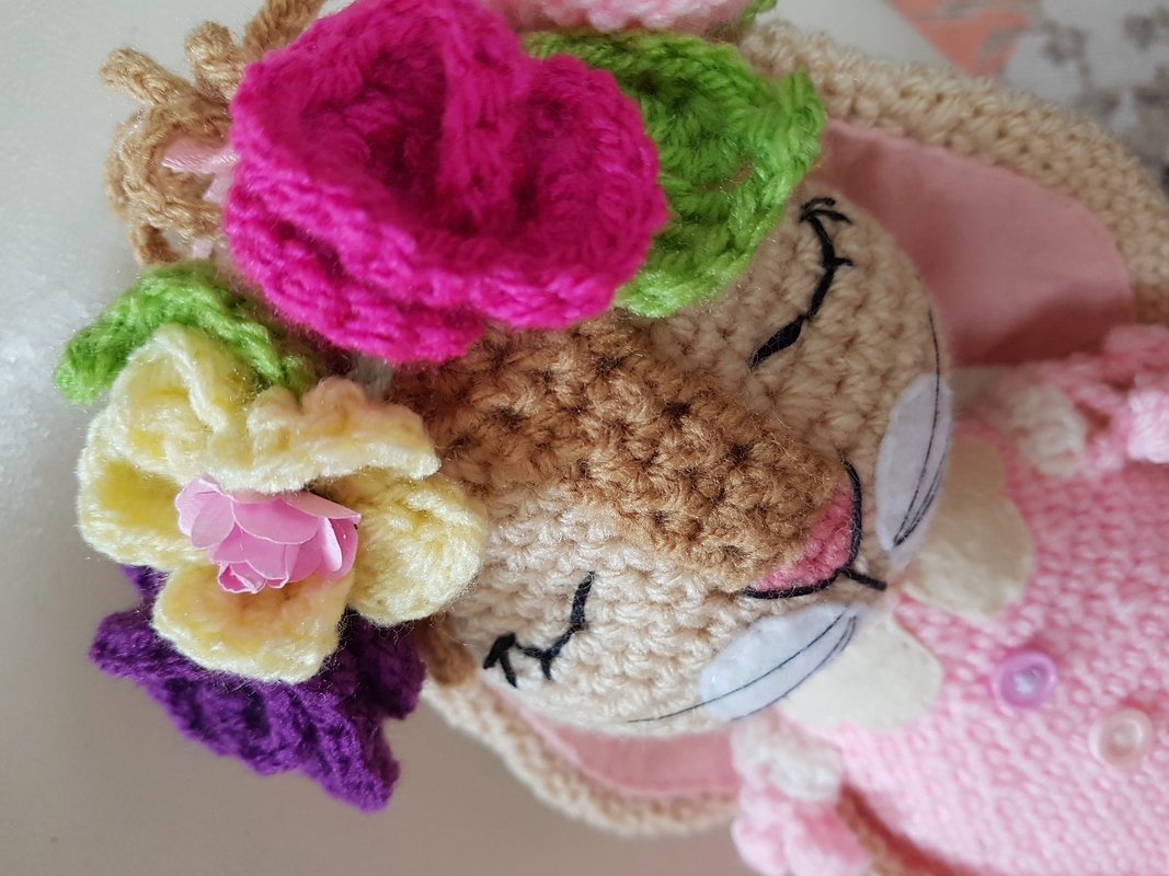 Hasendame Lola liebt Sonnenschein, süßen Blütenduft und lange Spaziergänge. Dabei sammelt sie ihre Lieblingsblumen und trägt sie als Kranz auf dem Kopf.