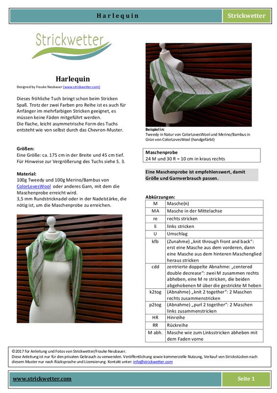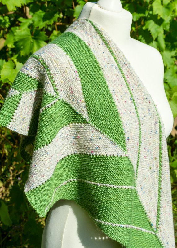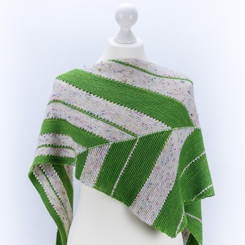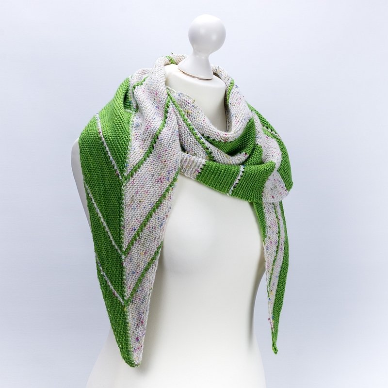 The fun that this cheerful shawl brings, already starts while knitting. It is suitable even for knitters who don’t have much experience knitting with two colors, as there is no need to carry the yarn.