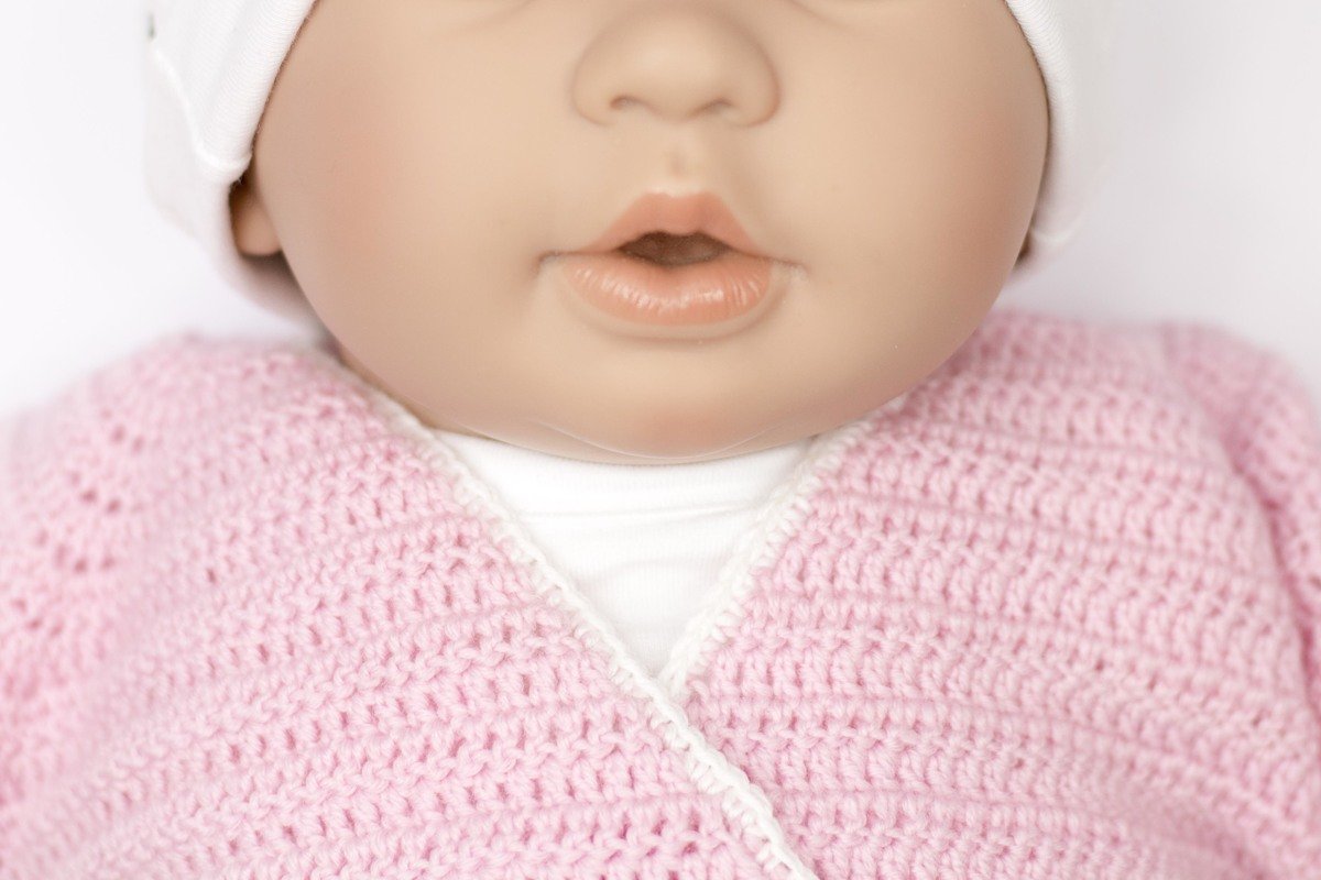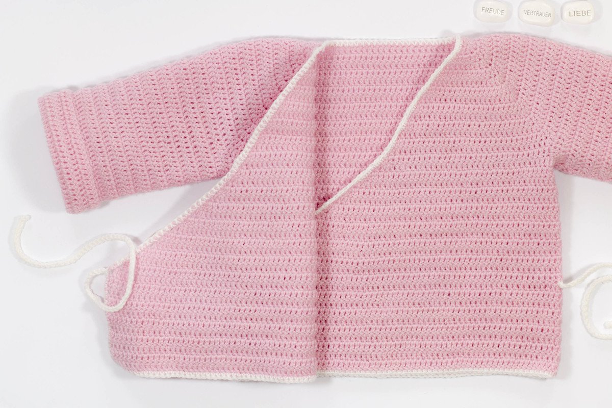 Diese süße Baby Wickeljacke wird raglan von oben gehäkelt und kommt daher komplett ohne Nähte aus. Hier kann nichts drücken.