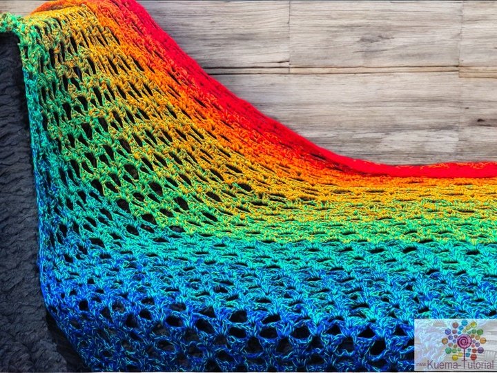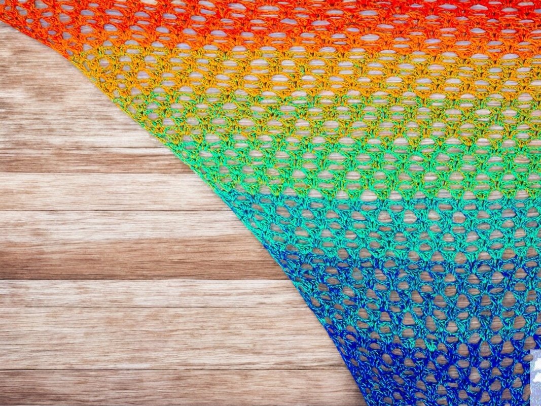 A lightweight summer triangle shawl with a beautiful rainbow gradient – easy to crochet and perfect for beginners. Made with a 4-ply yarn cake (820 yard / 750 m) using a US C (2); UK 11