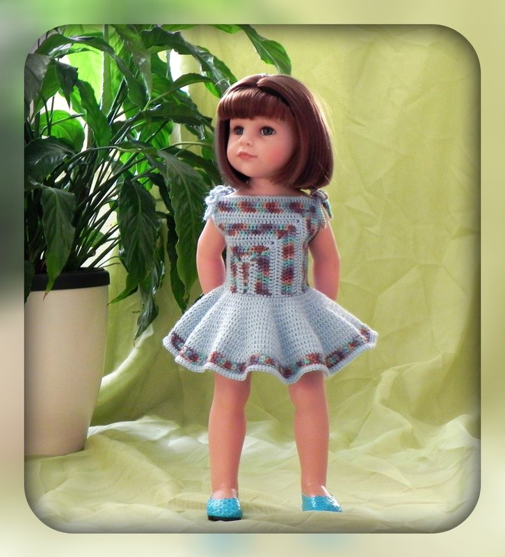 This is a crochet pattern with many pictures to show the neccessary steps how to make a dress for 18-inch dolls.